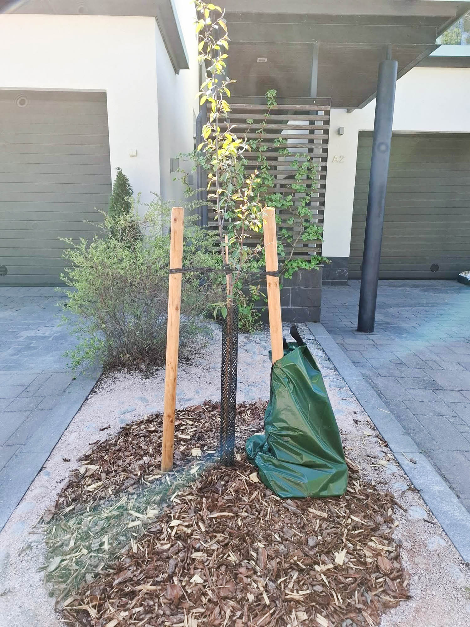 - Puiden tuenta ja kastelu: uudet puut tuettiin sitomalla ne aitatolppiin ja niiden ympärille kiinnitettiin kastelupussit, jotka annostelevat vettä juurille tasaisesti pari kertaa viikossa ensimmäisinä kasvuvuosina.