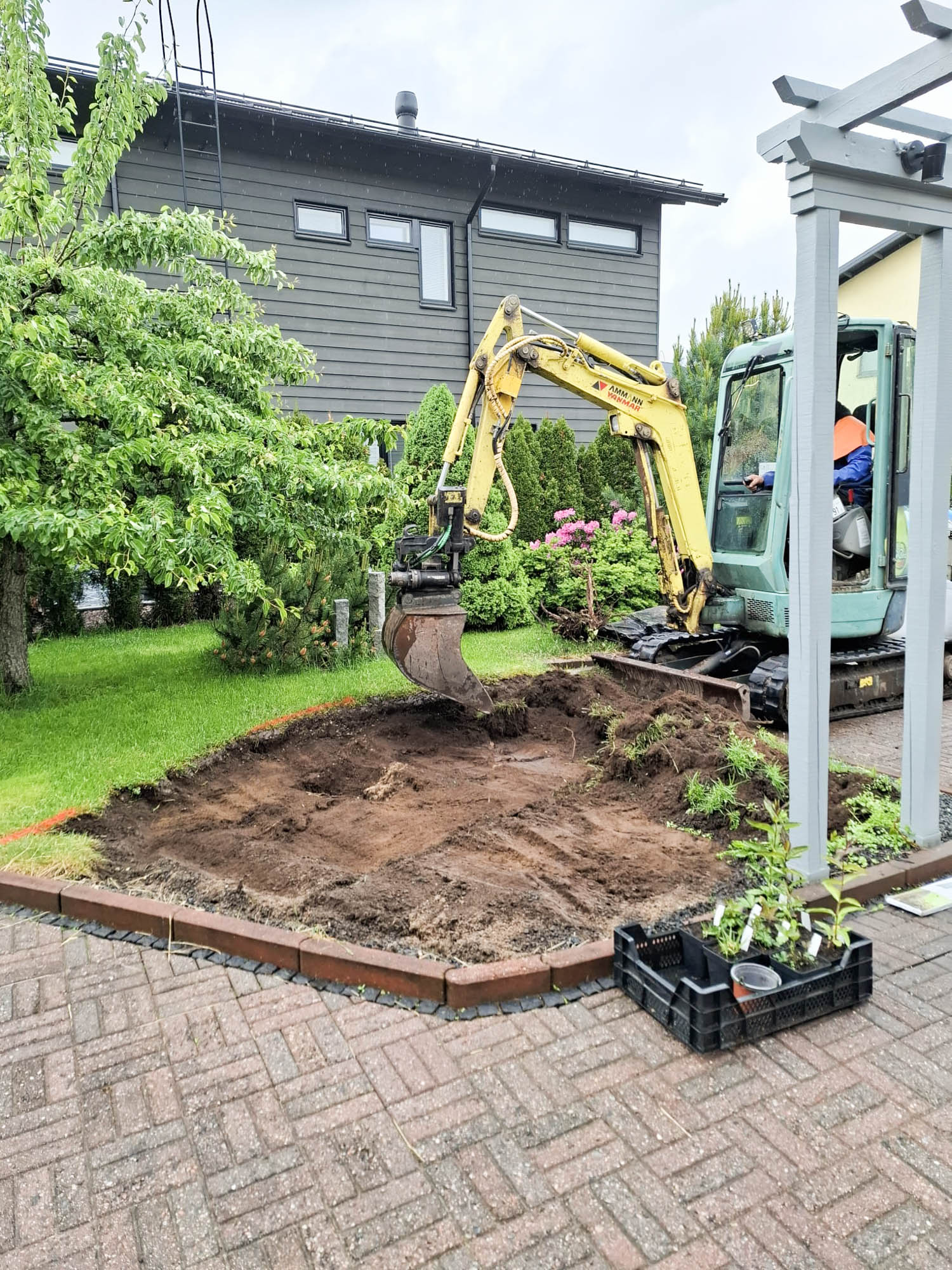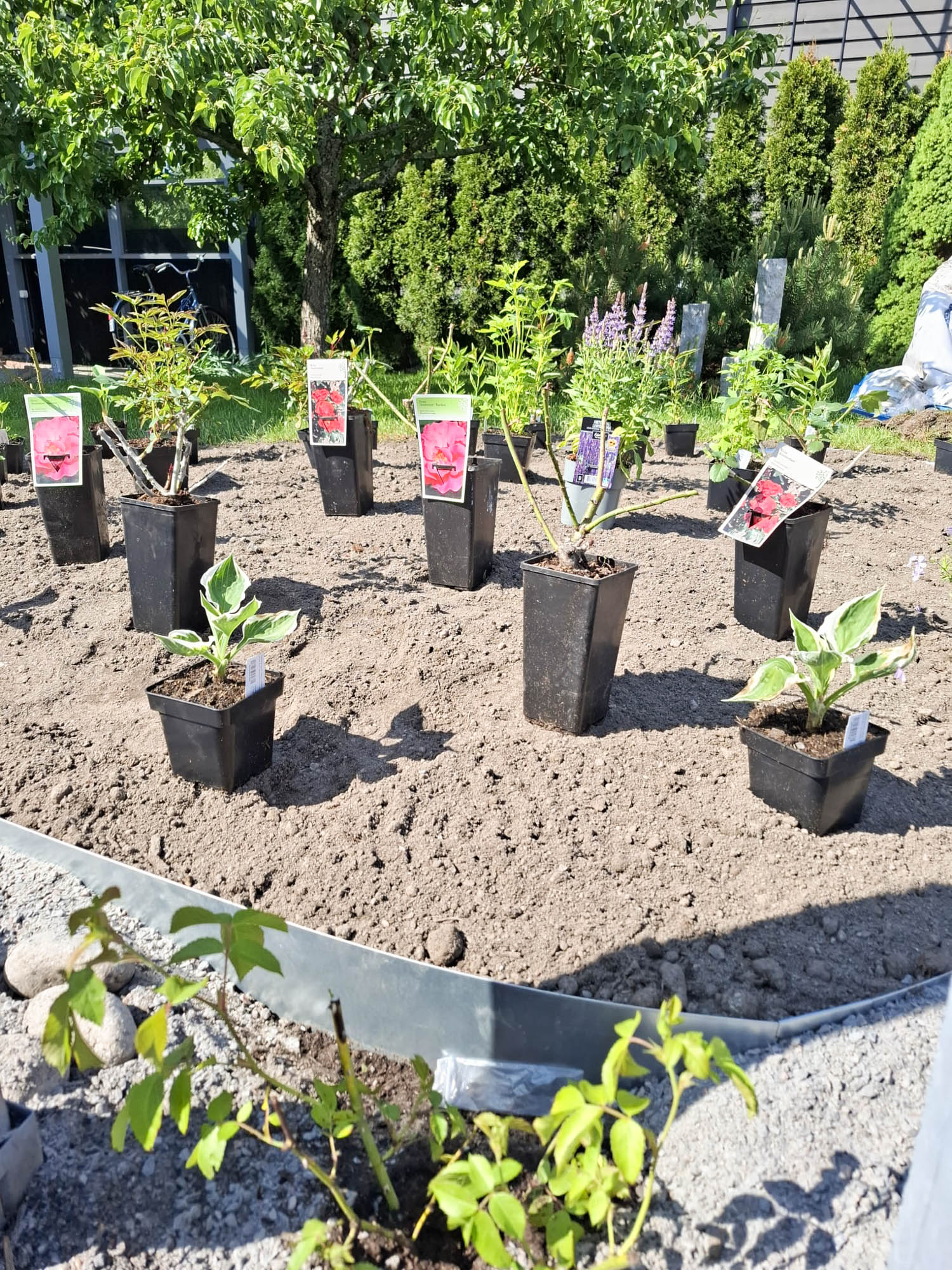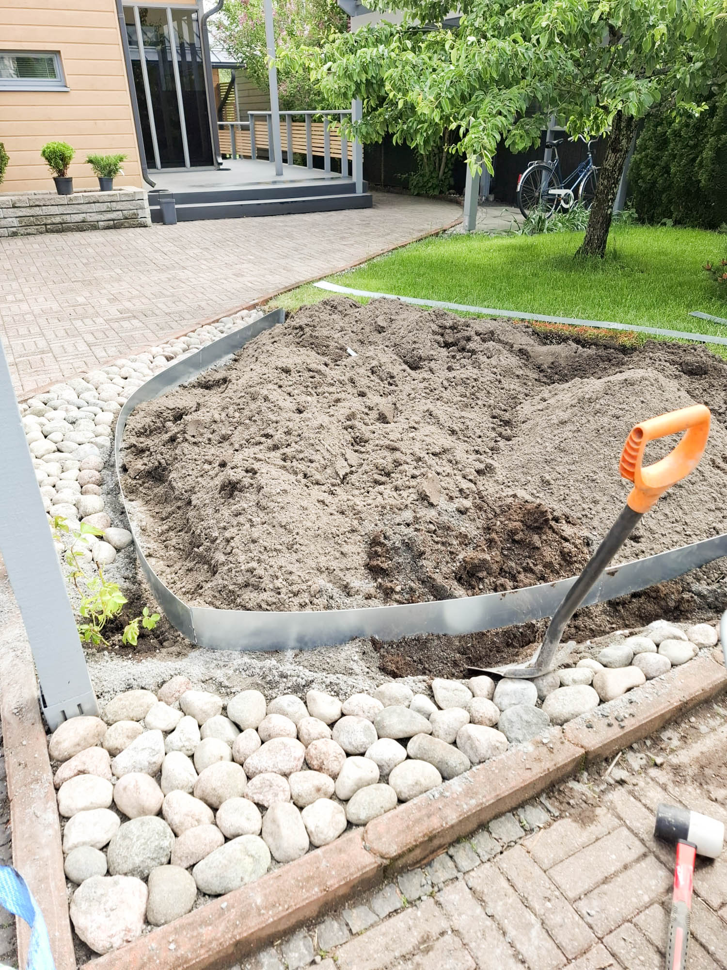 Ensimmäiseksi kaivettiin pienkaivinkoneella vanhan viiniköynnöksen juurakko ylös. Se olikin muodostanut vankan juuriston vuosien varrella. Tilalle istutettaisiin talvenkestävä näyttävä Flammentanz köynnösruusu. Pernnapenkin alue kaivettiin vanhalle nurmikko-alueelle riittävän syväksi tuleville perennoille ja ryhmäruusuille. Alue täytettiin ravinteikkaalla istutusmullalla. Tämän jälkeen päästiin asentamaan reunoihin tuleva rajauspeltinauhtaipui maniosti kaareviin penkin muotoihin. Kauniista pyöreistä luonnonkivistä rakennettiin kivireunus antamaan viimeistellyn näkymän uudelle perennapenkille.