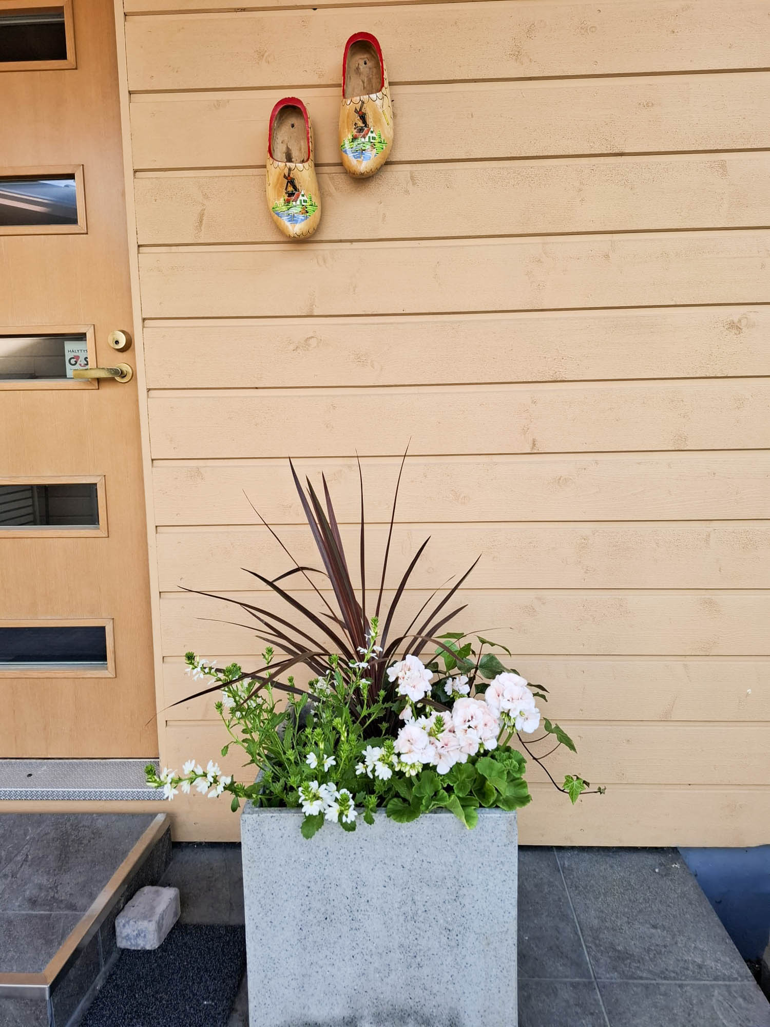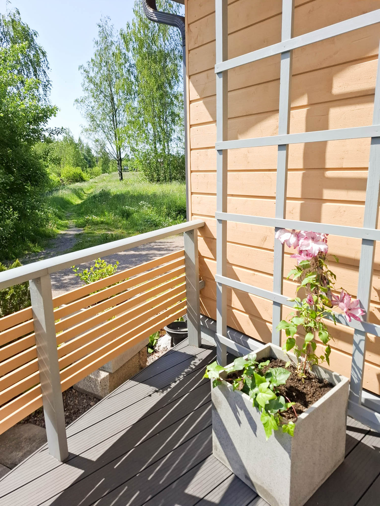 Olemassa olevaan istutusaltaaseen tehtiin täydennysistutuksia havuilla sekä kadun varteen lisättiin kookkaiden tuijien väliin ruusuangervopensaat. Muita ruukkuistutuksia tehtiin muu rungollinen pikkusyreeni Palibin sekä kesäkukka istuksia. Vanhaa viiniköynnöstä myös kevennettiin hieman leikkauksella. Pihalla olevan päärynäpuun olin käynyt leikkaamassa, jo keväällä. Näin pihapiiriä saatiin uudistettua vehreämksi ja kauniiksi katsella uusilla istuksilla.