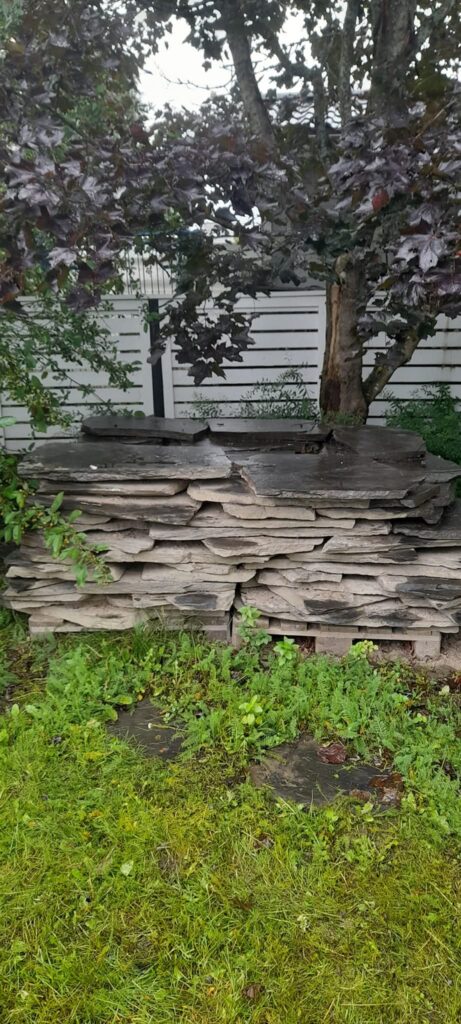 Seuraavaksi rakennettiin vilkasliikenteisen kadun näkösuojaksi patio-alue liuske- ja luonnonkivistä. Isot luonnonkivet olivat paikalla jo valmiiksi ja näiden ympärille istutettiin korkeat timanttituijat ja lumimarjapensaat näkösuojaa antamaan kadulle. Hedelmäpuut istutettiin toiseen reunaan, antamaan suojaa suoraan ikkunoihin. Toiselle sivulle lauta-aidan eteen istutettiin syreeni-aita myöskin näkösuojaksi kadulle.