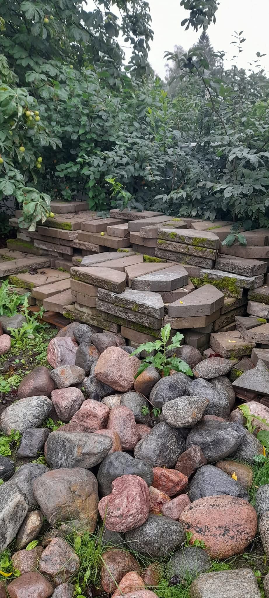 Piha oli n. 20 v. sitten voittanut pihasuunnittelun ja piharakentamisen palkinnon. Pihaan oli silloin rakennettu mm. iso vesiallas luonnonkivistä puusiltoineen ym. Nyt kuitenkin haluttiin siitä luopua, koska eteen oli tullut salaojaremontti ja piha jouduttiin aukaisemaan. Luonnonkiviä oli siis runsaasti tarjolla. Liuskekivistä oli myöskin tehty aikoinaan polkuja, jotka olivat nurmikon keskelle vajonneet. Niitäkin oli siis runsaasti käytettävissä. Myöskin erilaisia muurikiviä oli jäänyt ylimääräiseksi. Näistä materiaaleista minua pyydettiin suunnittelemaan uusia alueita pihaan.