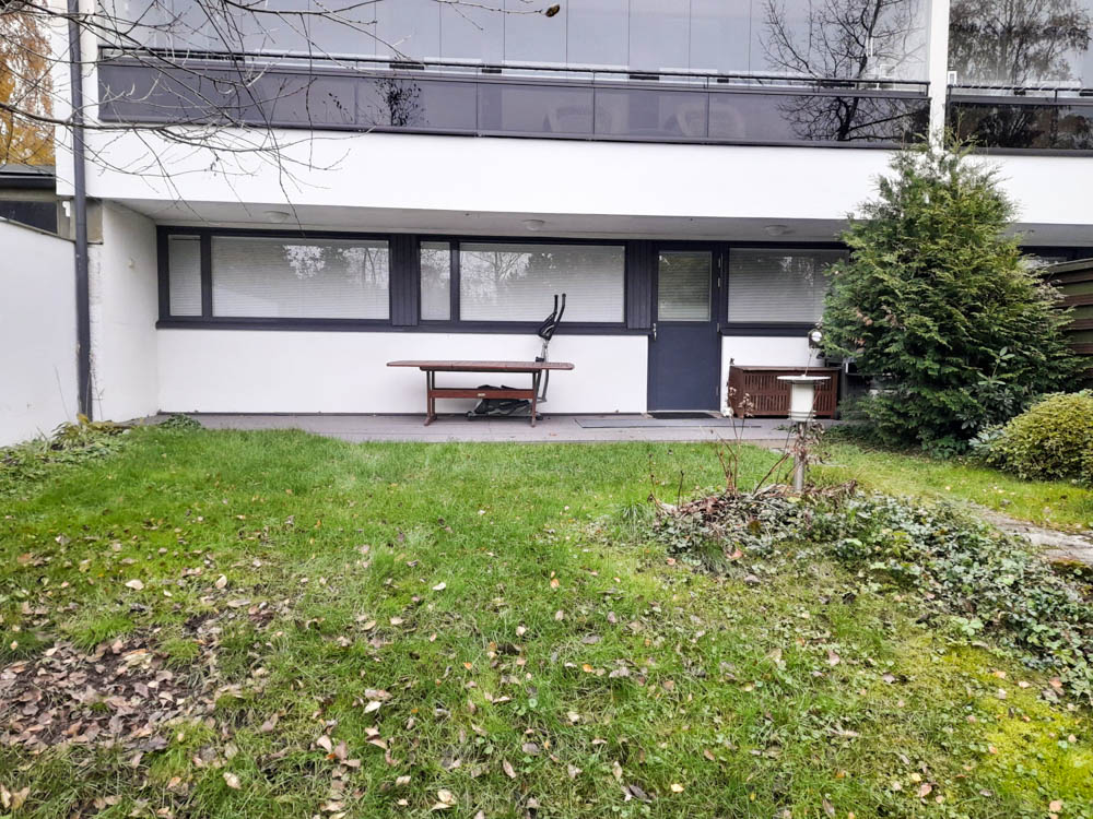 Taloyhtiö on 60-luvulla rakennettua pelkistettyä arkkitehtuuria ja piha mukautettiin siihen