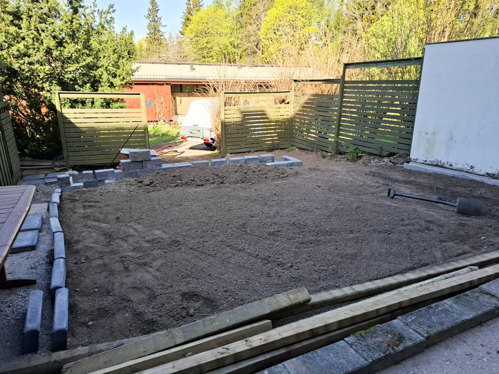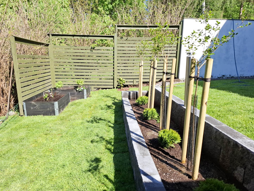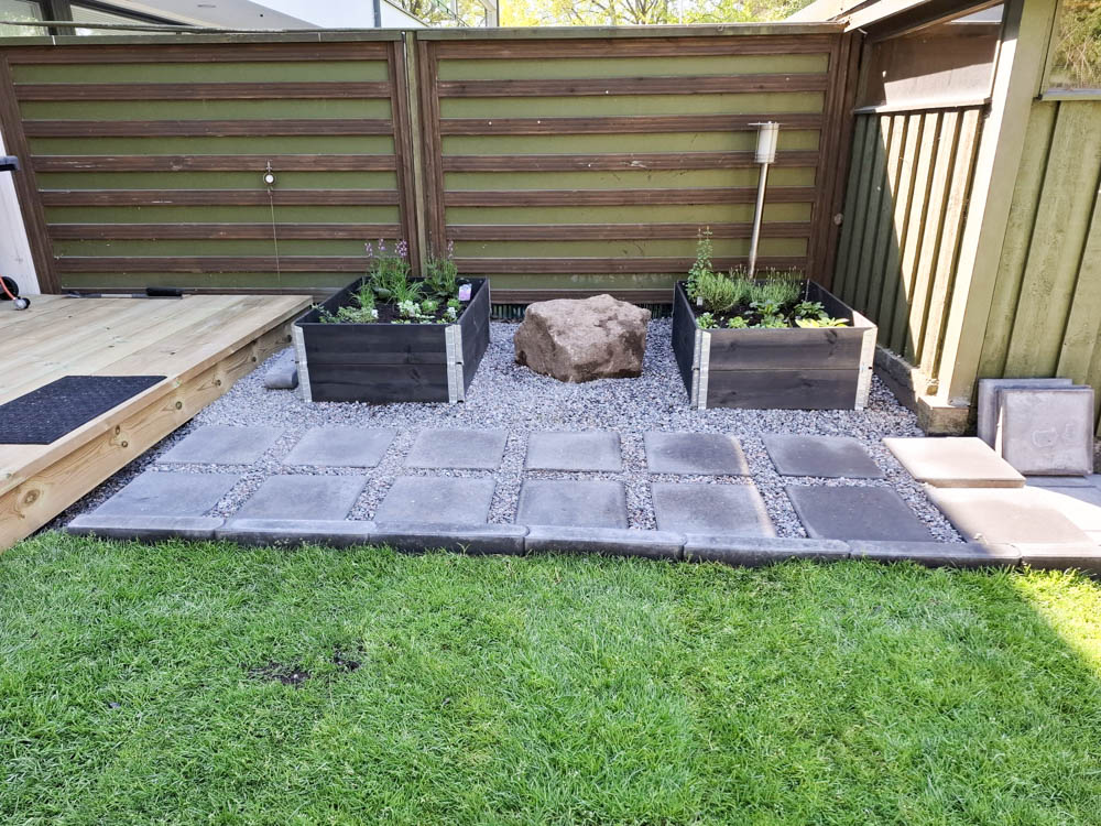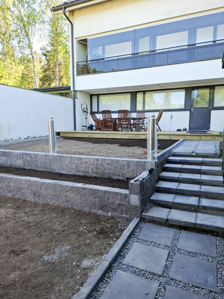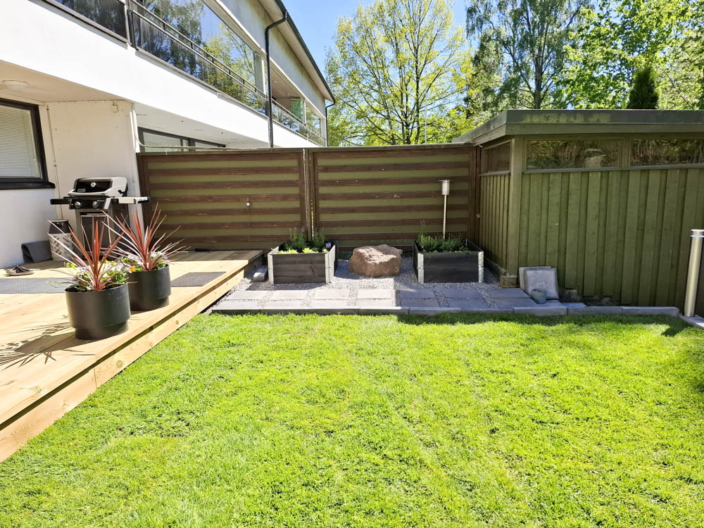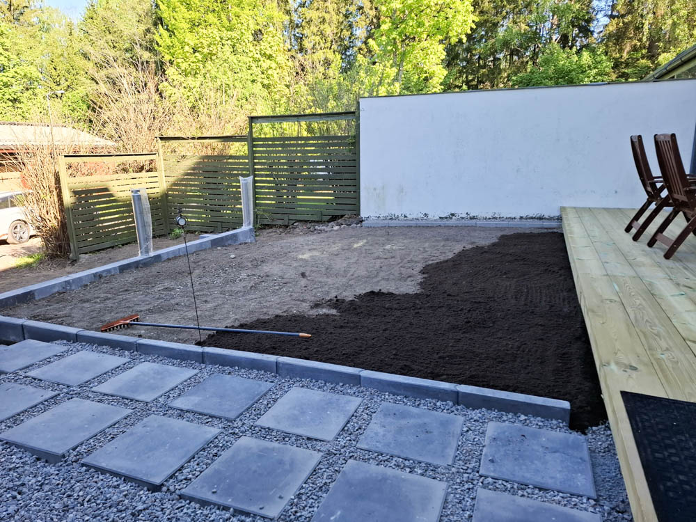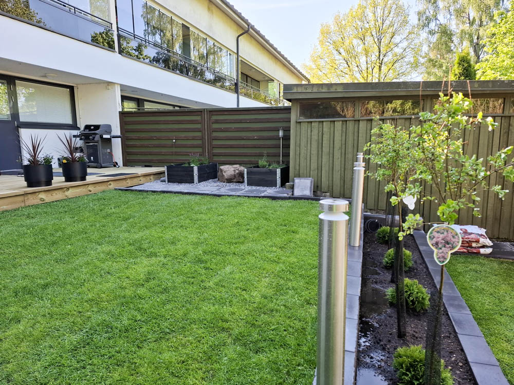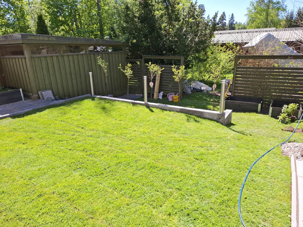 Pihalle haluttiin myös pehmeää nurmikkoa etenkin lapsia ja pikkukoirien oleskelua huomioiden. Nurmikoksi valittin heti valmis pehmeä ja kestävä premium luokan Siirtonurmikko.fi. Pihan valmistuminen ja nurmikon asentaminen ajoittuivat hellekauteen, joten kastelusta piti huolehtia erityisen hyvin sadettimilla ja letkukastelulla päivittäin.