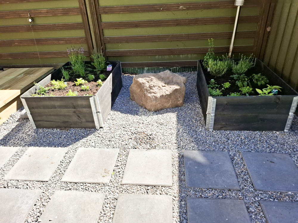 Asiakkaan toiveisiin vastaten aurinkoiseen kohtaan yläpihalle asennettiin kevyet, puiset kasvatuslaatikot yrttejä ja marjapensaita varten. Yläpihaan sijoitettiin yrttilaari, jossa mm. laventeli, minttu, persilja ym. yrtit viihtyvät ravinteikkaassa ja hyvin kuivatettavassa kasvualustassa. Alapihalla taas kasvuvoimaiset herukkapensaat tuottavat satoa ja houkuttelevat pölyttäjiä pihan aamupäivän auringossa.