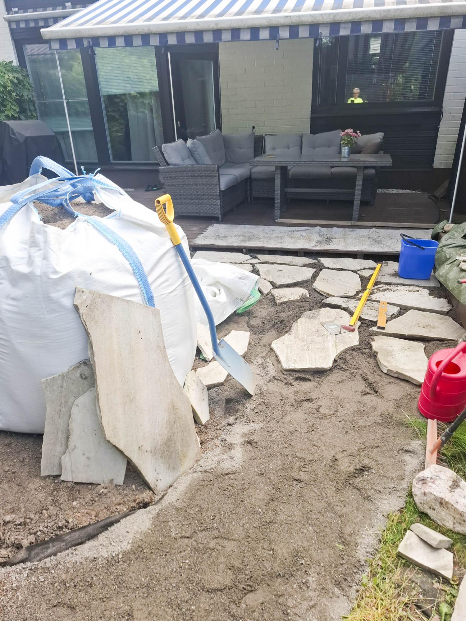 Rivitalopihassa oli aloitettu rakentamaan liuskekivi-aluetta. Työ oli kuitenkin osoittautunut liian aikaa vieväksi ja muutenkin hankalaksi toteuttaa. Niinpä meihin otettiin yhteyttä. Tein alueelle pienimuotoisen suunnitelman asiakkaan toiveiden mukaisesti vanhan suunnitelman mukaan.