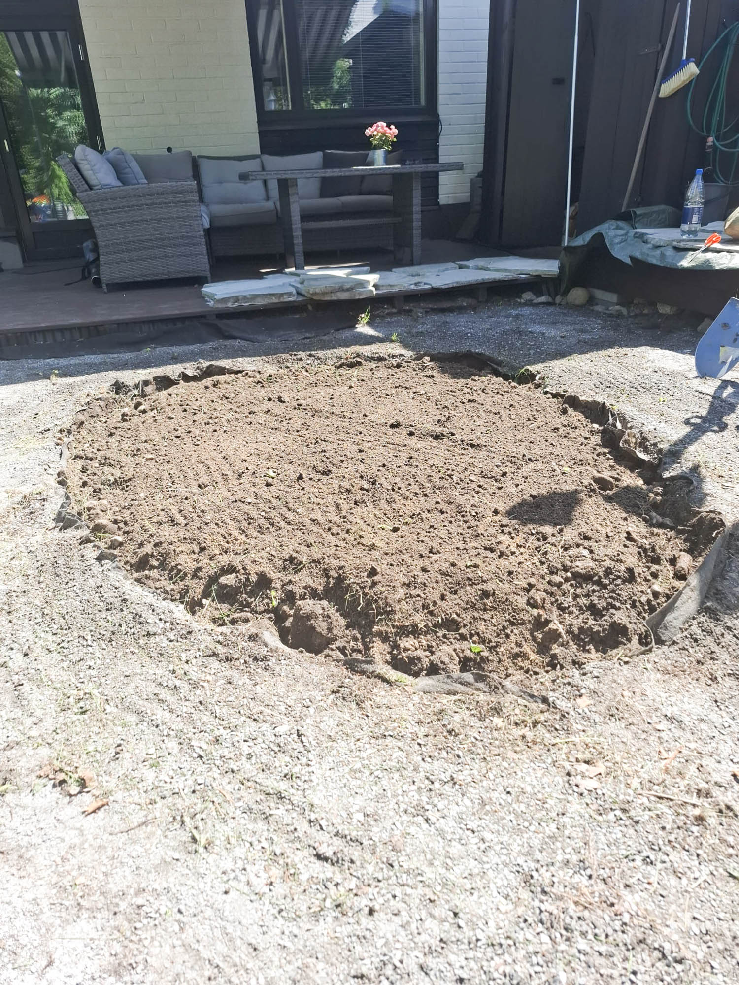 Pihalle ei päässyt lainkaan kaivinkoneen kanssa, joten työ jouduttiin tekemään lapiotyönä. Kaivoimme ensin vanhan nurmikko-alueen kivialueen keskeltä pois. Sen jälkeen se täytettiin istutusmullalla, joka saatiin nosturi-autolla nostettua kohteeseen. Tämän jälkeen asennetiin peltireunus reunoihin eroittamaan eri alueet toisistaan. Tämän jälkeen tasoitettiin kivituhkalla liuskekivien alle tuleva maa, joka oli jo aiemmin rakennettu oikeaoppisesti kalliomurskeella. Liuskekivien välit täytettiin myös kivituhkalla. Viimeiseksi päästiin istuttamaan alueelle tulevat kääpiövuorimännyt, maanpeitekasvit gröönlanninhanhikkia, turkestaninmaksruohoa sammalleimua sekä koristeheiniä. Kasvit peittävät kivasti alueen levitessään. Pihan kokonaisilme muuttui raikkaaksi ja helpommaksi liikkua.